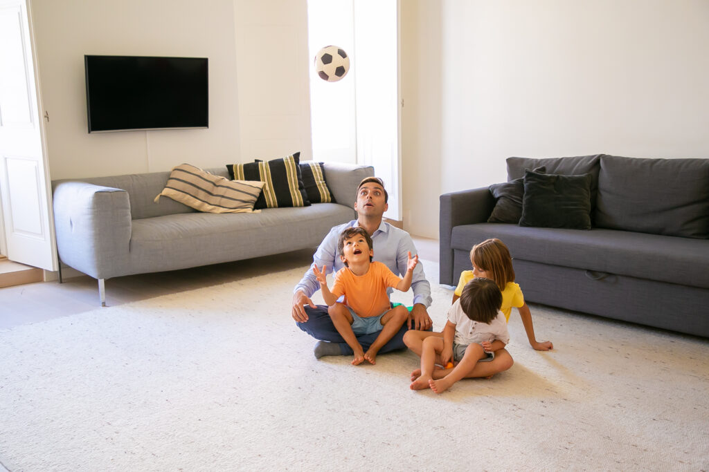 Exited father sitting on carpet with children and playing. Cute playful boy throwing up ball and looking at it. Lovely kids playing with dad at home. Childhood, game and fatherhood concept